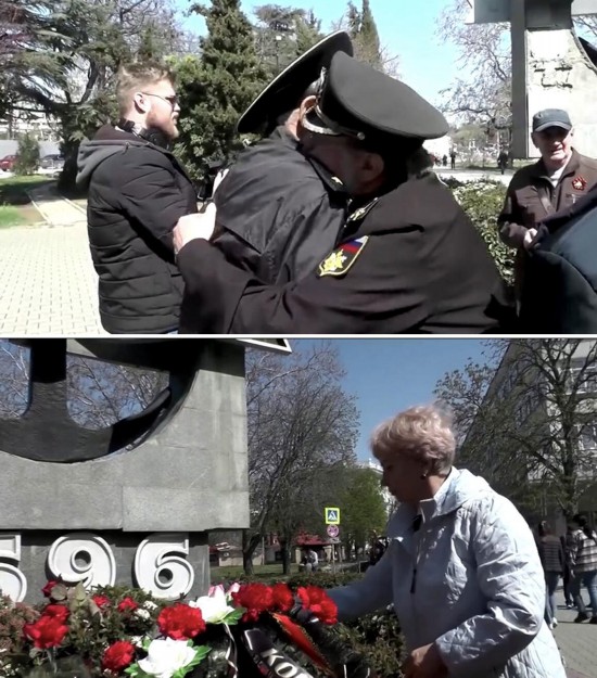 一些参与者互相拥抱,还有一些人献上鲜花,以纪念俄罗斯黑海舰队旗舰“莫斯科”号导弹巡洋舰。