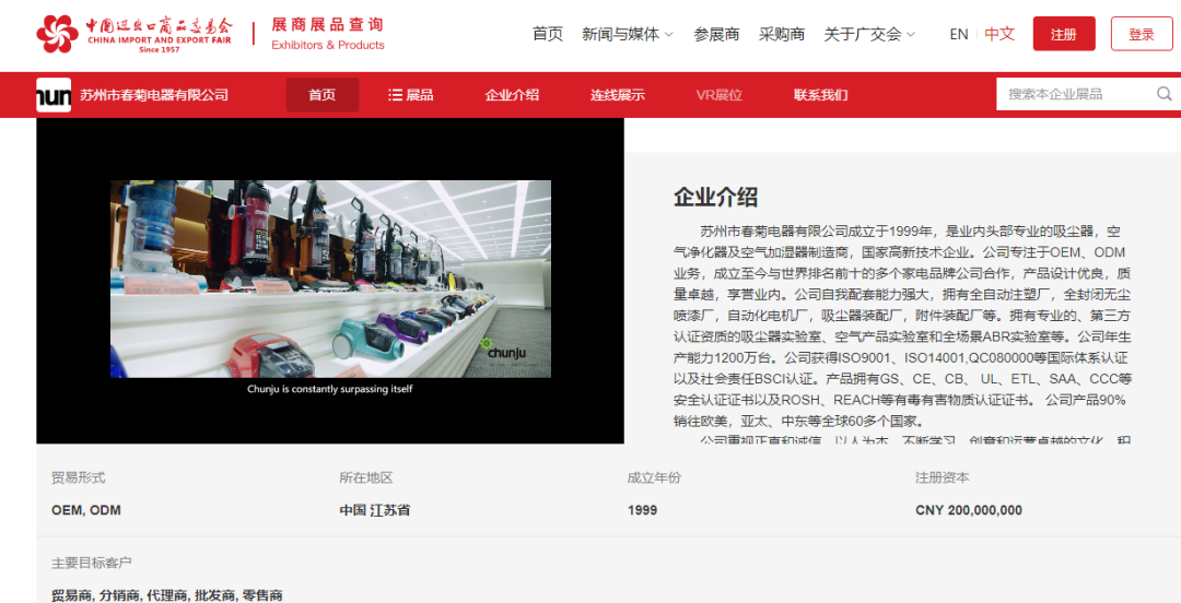在苏州市春菊电器有限公司的“云上展馆”,企业介绍、展品介绍一目了然。点击连线展示,还能以视频形式了解更多企业和产品信息。“线上参展这种形式很新颖,既符合疫情防控工作需要,对企业而言也能让更多人看到。”春菊电器相关负责人表示,广交会线上平台还能帮助企业稳订单、保市场,维护产业链、供应链的开放稳定。