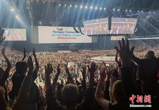 资料图:当地时间4月2日,法国总统马克龙在巴黎近郊楠泰尔举行大型竞选集会,意图加强与选民互动,进一步提振选情,为竞选连任做好准备。主办方称超过3万人参加集会。 中新社发 李玥 摄