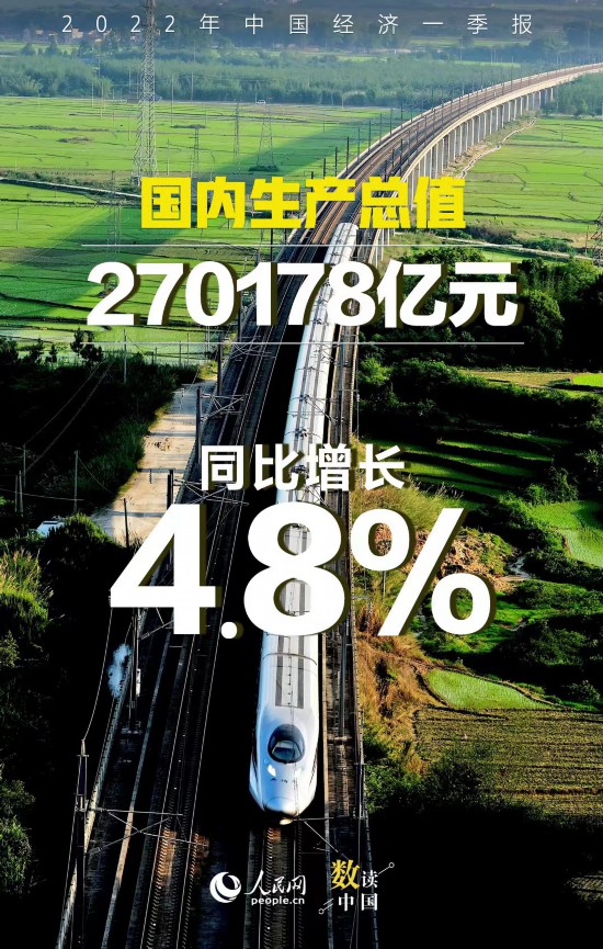 据国家统计局消息,初步核算,一季度国内生产总值(GDP)270178亿元,按不变价格计算,同比增长4.8%,比2021年四季度环比增长1.3%。