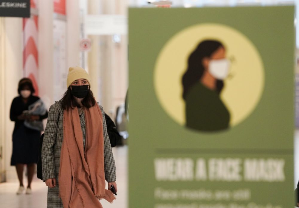 3月29日,人们从美国纽约世贸中心车站内的防疫提示牌旁走过。新华社记者王迎摄