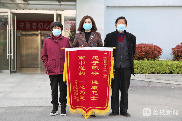 我苏网讯 4月16日,连云港市灌云县人民医院行政楼前,两位老人给该院副院长冯艳送来一面锦旗。“忠于职守,健康卫士;雨中送药,一心为民”,短短16个字见证了现场浓浓的医患深情,彰显了白衣天使在疫情防控中践行为民服务的真挚情怀,也表达了群众对医护人员日夜坚守、为民解忧的感激之情。