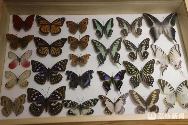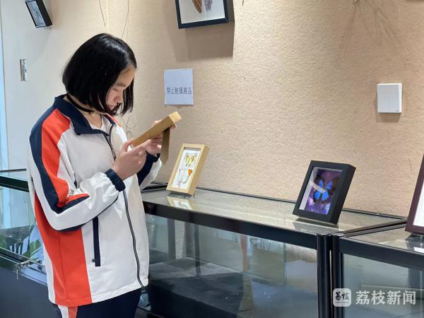 在南京外国语学校展览教室,玻璃柜中、墙上展示着各种昆虫标本,有蝴蝶、飞蛾、甲虫、天牛、蚂蚱、蝗虫……共116种标本都由王子慧制作。为什么会喜欢昆虫?王子慧笑着说:“从小就特别喜欢。在我还不会走路的时候,就经常趴在地上看蚂蚁。比如说这些蝴蝶,它们的颜色非常绚丽,还有那些不起眼的蚂蚱、螳螂,观察它们从小到大的蜕变是非常有趣的。”