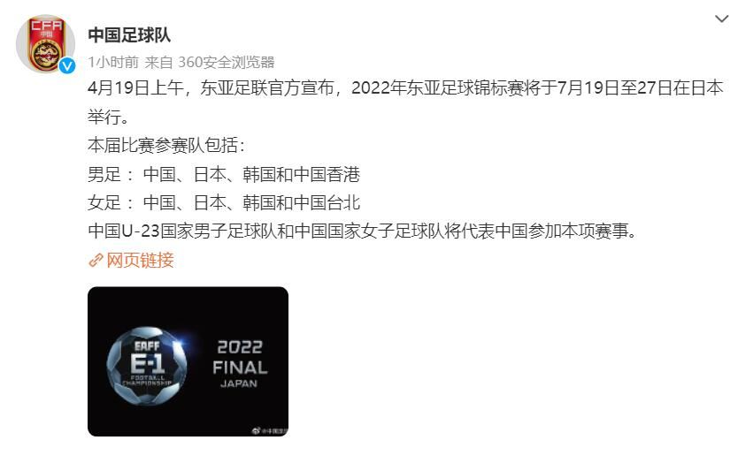 荔枝新闻讯 据@中国足球队消息,4月19日上午,东亚足联官方宣布,2022年东亚足球锦标赛将于7月19日至27日在日本举行。