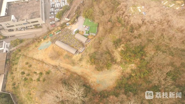 被反映的这个小山包,位于南京市玄武大道南侧的王家湾,北面是玄武大道,东面和南面是住宅小区,西面是商业地块。根据市民李先生提供的航拍照片显示,今年1月份前后,山包上就已经出现了四五间覆盖着绿色防护网的房屋和两个塑料大棚,大量黄土裸露在外面。李先生说,他家就住在附近,原来有一些人在这里种菜,有一段时间突然搭起塑料大棚过来,把原来很多树和绿化给破坏掉了,而且房子也很多。