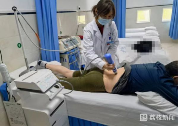 (图为南京市中西医结合医院援陕主管护师宋威莉为腰椎间盘突出症患者做冲击波治疗)
