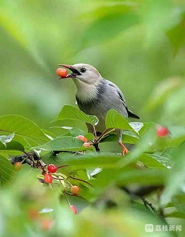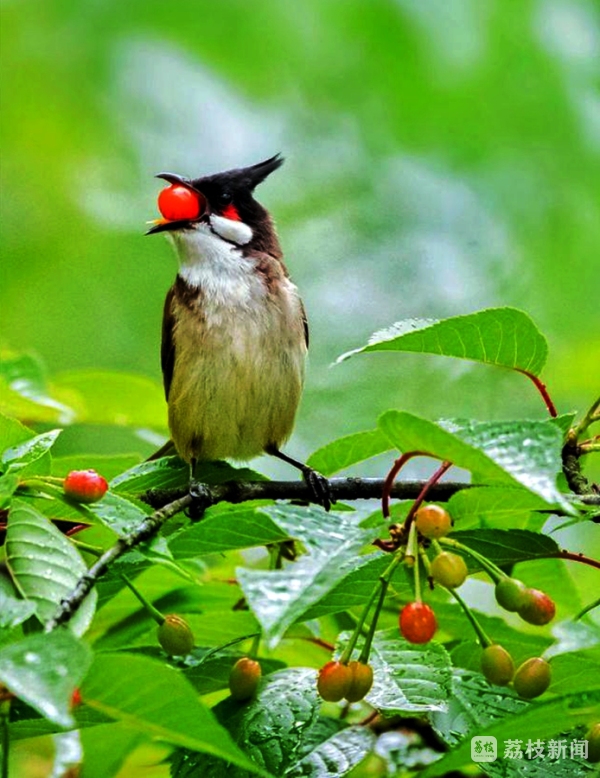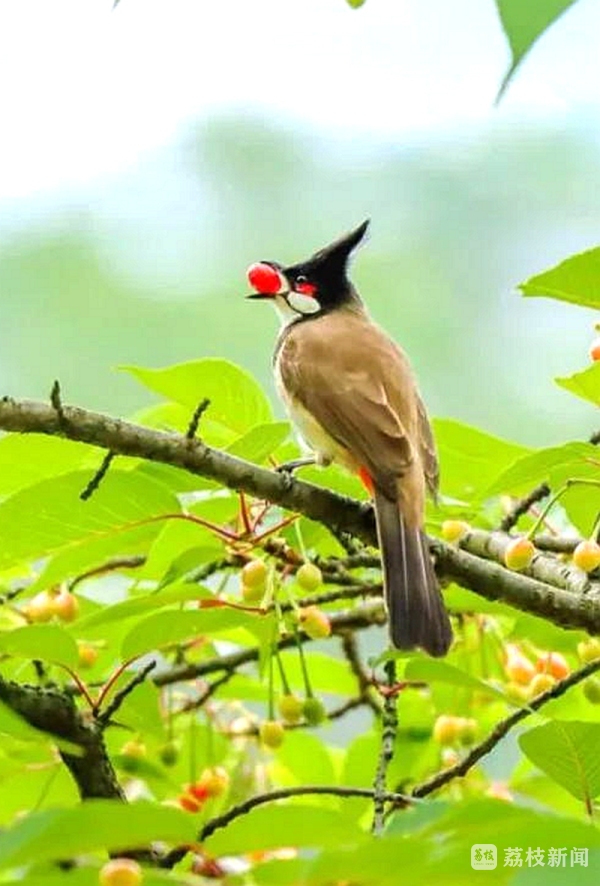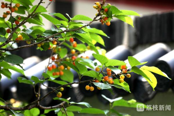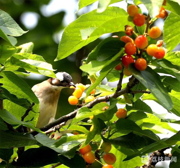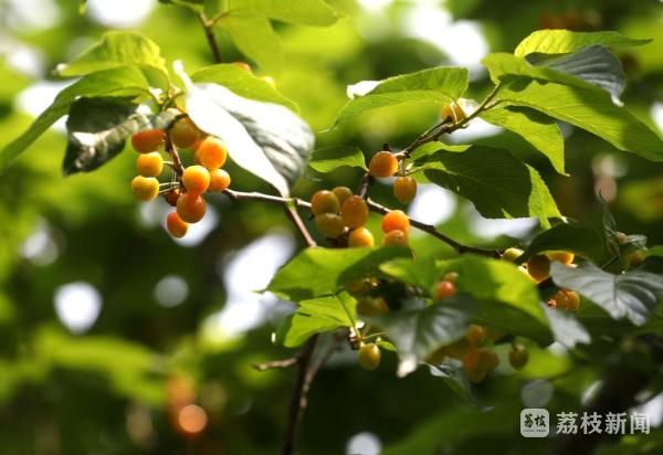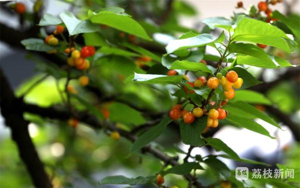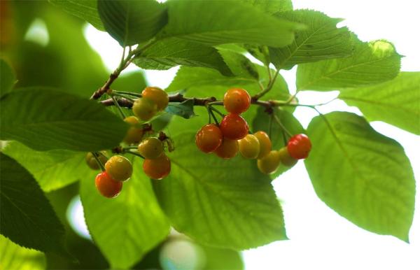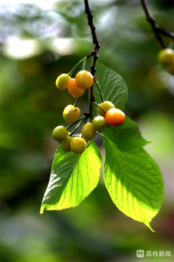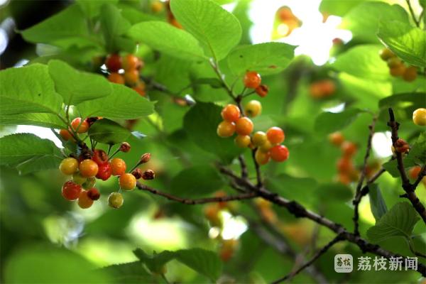 樱桃娇小玲珑,晶莹剔透,圆若珍珠,赤若玛瑙,其形色又颇似美女的朱唇。枝丫间,结满了一串串将要成熟的樱桃,水灵灵的,带着娇羞,在静候游客们的观赏;更等待着一群群鸟儿前来饱餐。