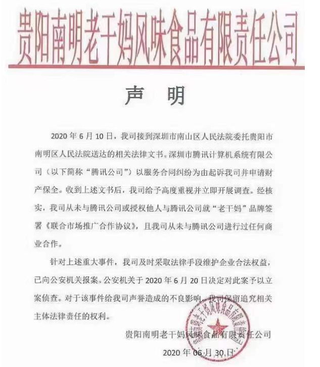 同年6月30日晚间,微信公众号“老干妈”发布声明称,公司从未与腾讯公司或授权他人与腾讯公司就“老干妈”品牌签署《联合市场推广合作协议》,且从未与腾讯公司进行过任何商业合作。针对上述重大事件,老干妈公司及时采取法律手段维护企业合法权益,已向公安机关报案。
