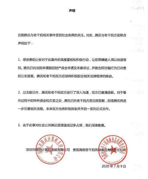 8天后,腾讯公司和老干妈公司发表联合声明称,腾讯公司已向法院申请撤回财产保全申请及本案诉讼,并已就合同诈骗行为向贵阳警方报案,腾讯公司和老干妈公司双方后续将积极配合相关法律程序的推进。此外,双方进行了深入沟通,已经厘清误解。对于事件过程中的种种误会和欠妥之处,腾讯公司已向老干妈公司方面当面致歉,未来将进一步完善相关流程。