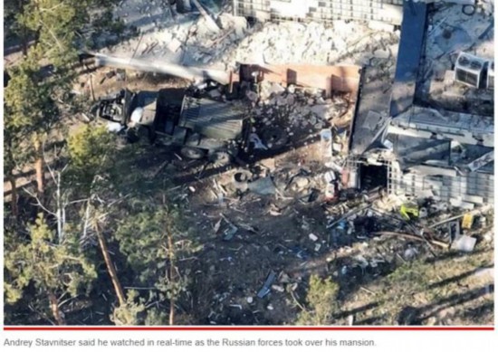 斯塔夫尼策周一告诉英国独立电视台(ITV):“他们摧毁了房子里的大部分监控摄像头,但有一个小型业余网络摄像头还在。”斯塔夫尼策说,他不想让俄军通过自己的房产炮击乌克兰首都附近地区,于是联系了乌克兰武装部队,提供了自己豪宅的坐标,并要求乌军实施轰炸。