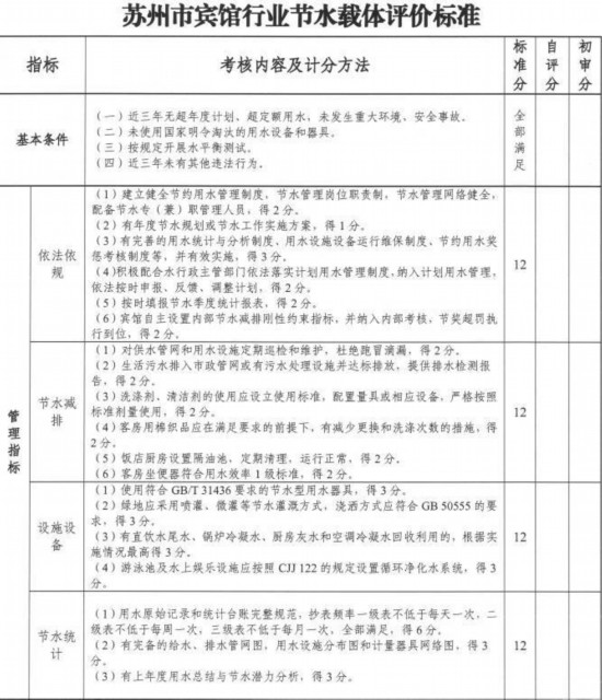满足近三年没有超定额用水,没有使用国家明令淘汰的用水设备和器具,没有发生重大环境、安全事故等条件的宾馆酒店都可以自主申报创建,经过考核评选,总得分80分以上(含80分)可获评“苏州市节水型宾馆”称号;总得分90分以上(含90分),并且获得绿色旅游饭店评定,可获评“苏州市节水减排示范宾馆”称号。苏海波告诉记者:“符合条件、达到标准的宾馆酒店,将授予相应的称号,今后定期会进行复查,实行常态管理。”