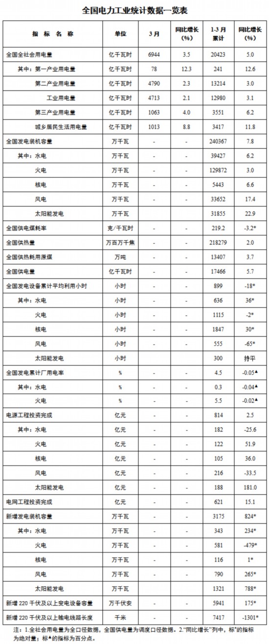 其中,水电、风电、太阳能发电快速增长。分品种看,3月份,火电由升转降,核电增速放缓,水电、风电、太阳能发电增速不同程度加快或由降转升。其中,火电同比下降5.7%,1—2月份为增长4.3%;水电增长19.8%,比1—2月份加快11.6个百分点;核电增长2.2%,比1—2月份放缓7.4个百分点;风电增长23.8%,1—2月份为下降7.6%;太阳能发电增长16.8%,比1—2月份加快10.3个百分点。