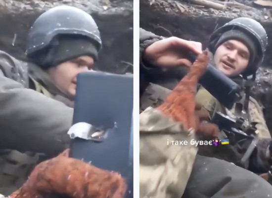 视频清晰可见,一颗子弹楔入了手机屏幕,手机的金属外壳也被削开一块。报道称, 这名士兵当时在战壕中,四周的枪声和爆炸声不绝于耳。目前还不清楚这段视频是在何时何地拍摄的,《每日邮报》也无法证实。