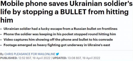 据英国《每日邮报》4月19日报道,在乌克兰东部地区激烈的战斗中,一名乌克兰士兵称自己幸运地“逃过一劫”,他随身携带的手机替他挡住了一颗子弹。