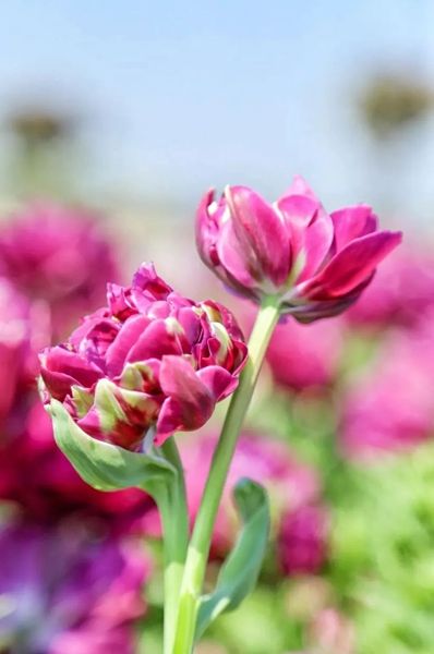 俗话说“好事成双”。在盐城市大丰区荷兰花海景区,继3月份后,再现并蒂郁金香,两个紫褐色的郁金香花朵并靠长在一起,共用一个花梗,在阳光下显得很是"恩爱"。