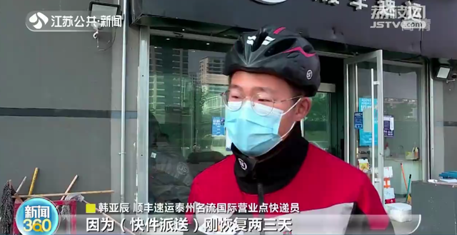 顺丰速运泰州名流国际营业点快递员韩亚辰表示:“因为快件派送刚恢复两三天,件量比较多,是我平时工作量的两三倍。”