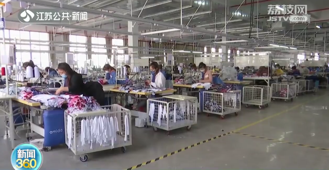 4月20日下午2点,江苏圣海服饰科技有限公司厂区内,工人们正有序排队,进行核酸检测采样。完成采样后,工人们立刻回到工作岗位,生产线上一派忙碌景象。