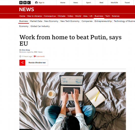 对俄能源制裁令欧洲面临能源紧缺。“欧盟表示,在家工作可以打败普京,”BBC21日以此为题的报道称,欧盟呼吁民众少开车、空调开小点并且每周在家工作3天 ,以减少对俄罗斯能源的依赖。报道说,欧洲表示无法找到俄罗斯能源的替代品,因此只能要求民众调整生活方式。