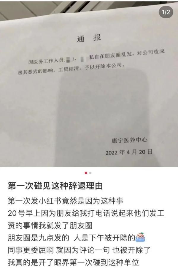 该网友发布的照片显示,康宁医养中心开除通报内容为:因两名医务工作人员私自在朋友圈乱发,对公司造成极其恶劣的影响,工资结清,予以开除。