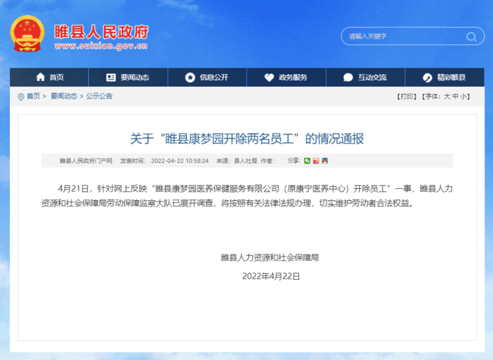 4月22日上午,据睢县人民政府网站消息,河南睢县人力资源和社会保障局22日发布通报称,4月21日,针对网上反映“睢县康梦园医养保健服务有限公司(原康宁医养中心)开除员工”一事,睢县人力资源和社会保障局劳动保障监察大队已展开调查,将按照有关法律法规办理,切实维护劳动者合法权益。