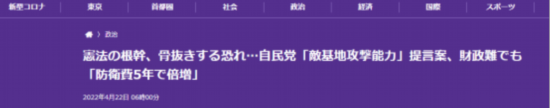《东京新闻》称,关于因自卫目的阻止对方疆域内导弹发射的“对敌基地攻击能力”,通过的建议草案在将该能力的名称更改为“反击能力”的基础上,考虑到对方国家的司令部等,把“指挥控制功能”也列入攻击目标。