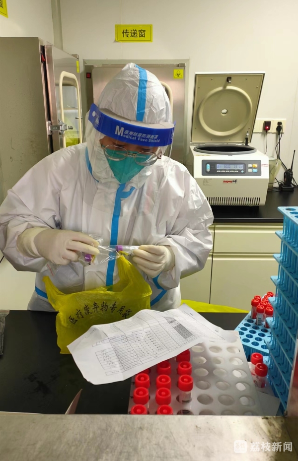 赵姗在医院主要负责核酸采样和检测工作。扬中疫情发生后,核酸检测需求激增,她每天采样人数在1000人左右,晚上还要继续在实验室进行检测,每天晚上回到家都接近11时。“看着她脸上的勒痕、憔悴的面容,真的很心疼。”贾庆荣说。