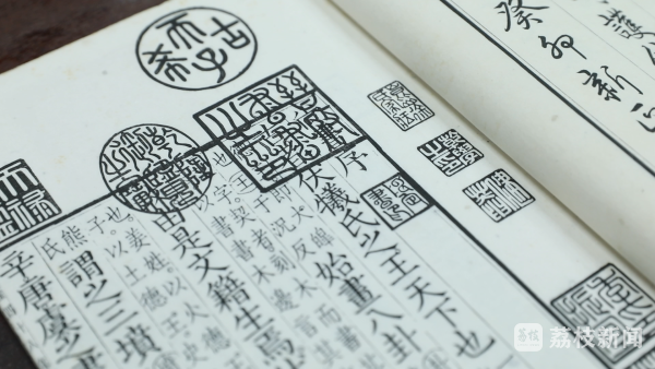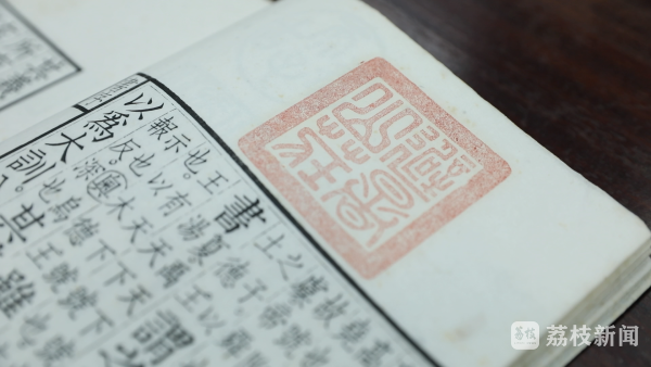 南京图书馆历史文献部馆员韩超向记者展示了一套书:“我们现在看到的这本书是,乾隆年间的仿相台岳氏五经。这本书本身不少图书馆也有收藏,但是我们这个收藏的一个特别之处,就是它上面有一个避暑山庄的章,提起避暑山庄我们就知道是皇家的别院了,那说明这部书是被皇家收藏过的,可能乾隆本人也翻阅过这样一部书。除了这个章我们可以看到,它前面一页有各种各样的章,我们知道古人对于自己的收藏,他要怎么样表达一个所有权,那就要盖一个藏书章。那么在藏书章里,我们可以看到有一个是徐乾学的章,他是我们江苏昆山人,他有一件非常有趣的轶事,我给大家讲一讲,就是曾经康熙皇帝赐给他一道菜是御膳,这道菜皇帝就让徐乾学,自己去御膳房问厨子要怎么做这道菜的方子,他去要的时候,御膳房讹了他一千两银子。”