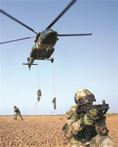 上图:4月21日,第72集团军某陆航旅联合某特战分队组织机降训练,锤炼部队立体协同作战能力。 张欢朋摄