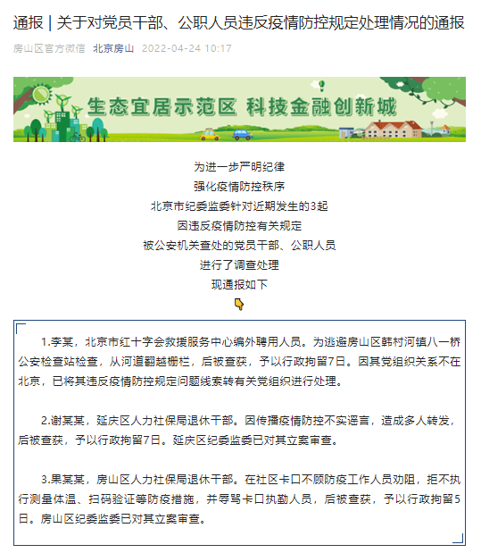 荔枝新闻讯 4月24日,“北京房山”微信公众号发布“关于对党员干部、公职人员违反疫情防控规定处理情况的通报”。通报全文如下: