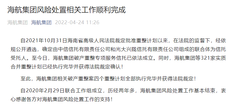 荔枝新闻讯 “海航集团”微信公众号4月24日消息,自2021年10月31日海南省高级人民法院裁定批准重整计划以来,在法院的监督下,经依规公开遴选,确定由中信信托有限责任公司和光大兴陇信托有限责任公司组成的联合体为信托受托人。至今日,海航集团破产重整专项服务信托已依法成立。同时,海航集团等321家实质合并重整计划已经执行完毕并获得法院裁定确认!