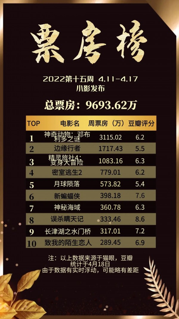 一周票房榜- 2022第15周 -(4.11-4.17)
