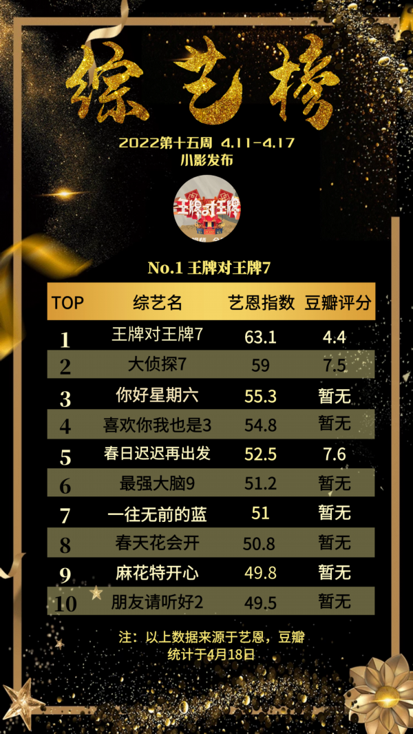 本周,综艺榜几无变化。《王牌对王牌7》《大侦探第七季》《你好星期六》始终占据榜前三;各类恋综的热度表现十分稳定,《喜欢你我也是第3季》《春日迟迟再出发》持续在榜;《朋友请听好第二季》热度稳定且小有上升,严敏执导的游历观察真人秀《新游记》刚开播虽未入榜,但人气不断攀升;职场类《初入职场的我们·法医季》,小成本投资,却意外“出圈”。
