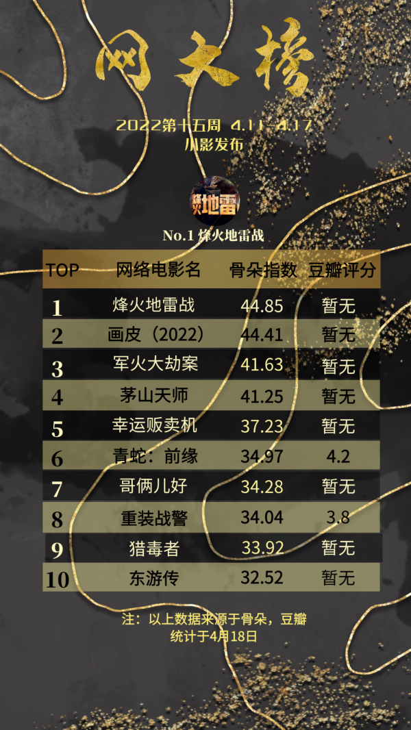 本周网络电影市场并没有出现太多亮点。战争片《烽火地雷战》继续霸榜;新片《画皮2022》排名第二,IP改编自漫画《仙山传奇》的《茅山天师》排名第四;喻恩泰主演的《幸运贩卖机》排名第五;喜剧类型的《哥俩儿好》排名第七。