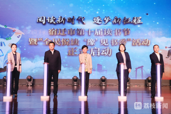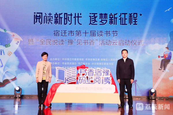 启动仪式上,宿迁市委常委、宣传部部长光华和宿豫区委书记殷其国为“书香宿豫•码上阅读”数字阅读公共空间推广计划logo揭牌。市委常委、宣传部部长光华,副市长武倩,宿豫区委书记殷其国,市文明办副主任、市全民阅读办主任王胜辉和宿豫区委常委、宣传部部长陈慧敏5位领导共同按下“阅读之印”,正式启动宿迁市第十届读书节。