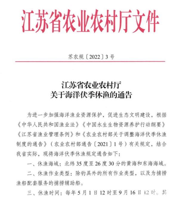 为进一步加强海洋渔业资源保护,江苏省农业农村厅近日发布公告,明确自5月1日12时至9月16日12时,于北纬35度至26度30分的黄海和东海海域实施海洋伏季休渔。