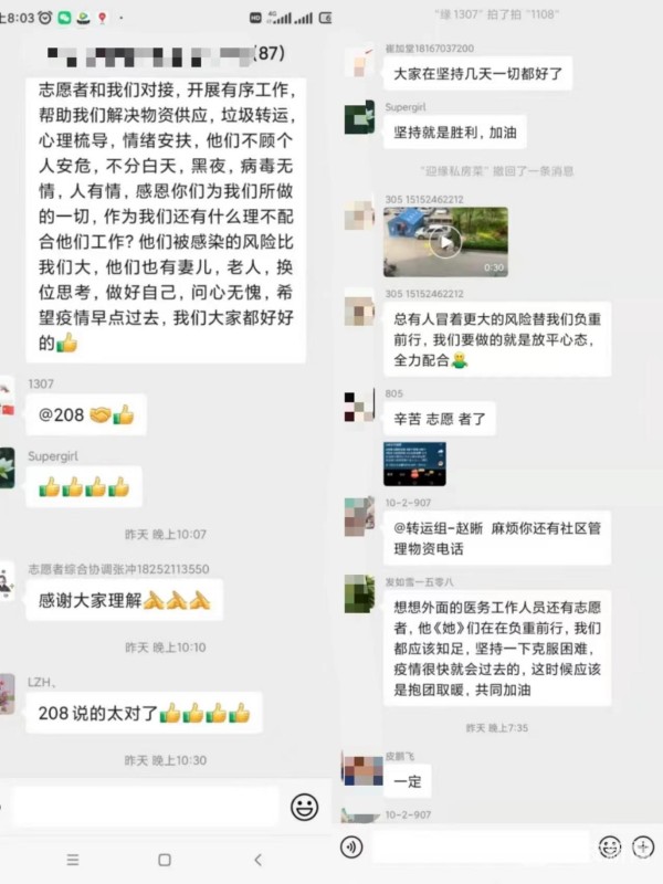 隔离不能隔爱,为了群众能更好更方便居家,张卫和队员们每天主动通过微信群了解有特殊困难居民的需求,及时沟通对接各小组,进行协调解决,竭尽全力为群众排忧解难,让群众感受到党组织的温暖没有被“隔离”,获得群众的点赞支持。他们也将群众的好评转化为携手抗疫的强大精神动力,众志成城打赢疫情防控阻击战歼灭战。