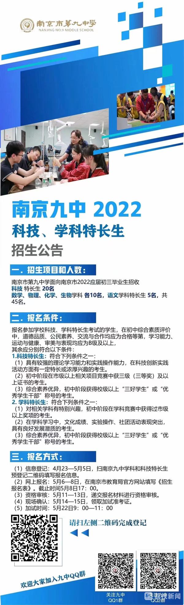 科技、学科特长生专业加试报名统一在网上进行,5月6日—8日,考生在南京市教育局官方网站报名。根据往年经验,大部分学校录取比例约10:1,由学校自主命题,王艳飞提醒,科技、学科特长生不能兼报。