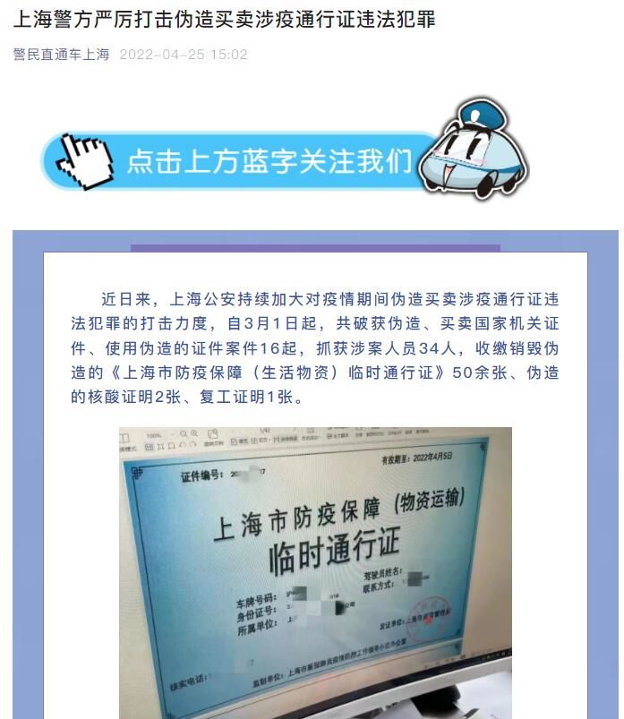 荔枝新闻讯 据“警民直通车上海”微信公众号消息,近日来,上海公安持续加大对疫情期间伪造买卖涉疫通行证违法犯罪的打击力度,自3月1日起,共破获伪造、买卖国家机关证件、使用伪造的证件案件16起,抓获涉案人员34人,收缴销毁伪造的《上海市防疫保障(生活物资)临时通行证》50余张、伪造的核酸证明2张、复工证明1张。