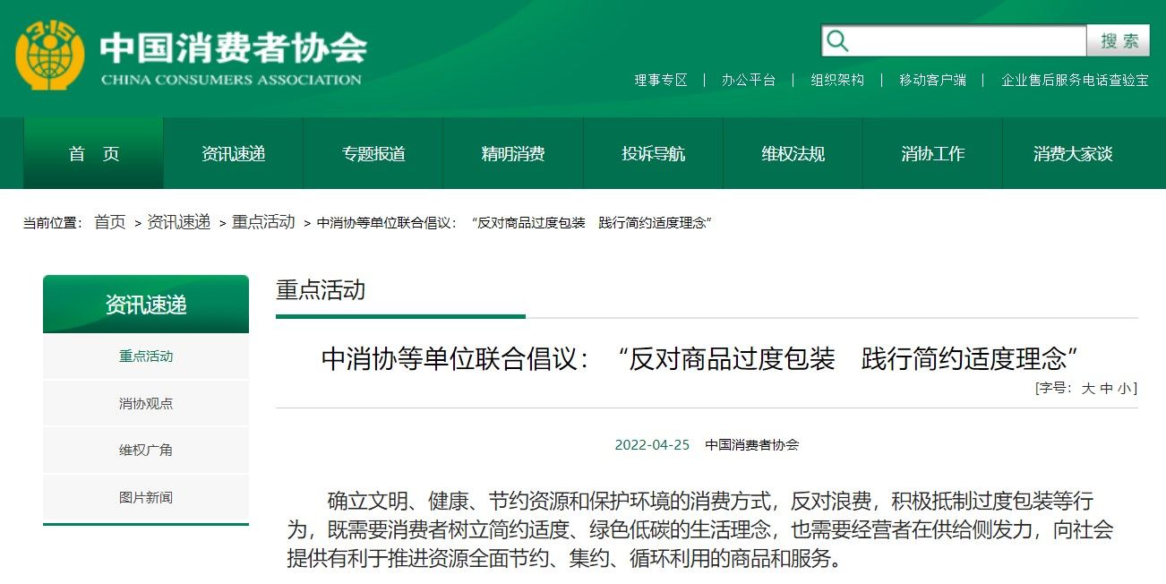荔枝新闻讯 中国消费者协会网站25日消息,为落实《消费者权益保护法》《固体废物污染环境防治法》《循环经济促进法》《清洁生产促进法》等法律中有关“反对浪费”“避免过度包装”的规定及党中央、国务院有关在消费领域增强全民节约意识,倡导简约适度、绿色低碳生活方式的工作部署,中国消费者协会联合中国工业经济联合会、中国轻工业联合会、中国商业联合会、中国包装联合会、中国连锁经营协会、中国香料香精化妆品工业协会、中国快递协会、中国质量协会、中国电子商会、中国食品工业协会、中国焙烤食品糖制品工业协会、中国酒业协会、中国造纸协会、中国洗涤用品工业协会等14家主要行业协会,共同向广大经营者与消费者发出“反对商品过度包装践行简约适度理念”的倡议,倡导经营者积极履行社会责任,向市场供给更高质量、更加绿色环保低碳的产品;倡导消费者在个人和家庭消费时,树立科学、理性的消费观念,尽量购买和选用资源节约型产品,遇到过度包装等浪费行为,主动投诉举报。