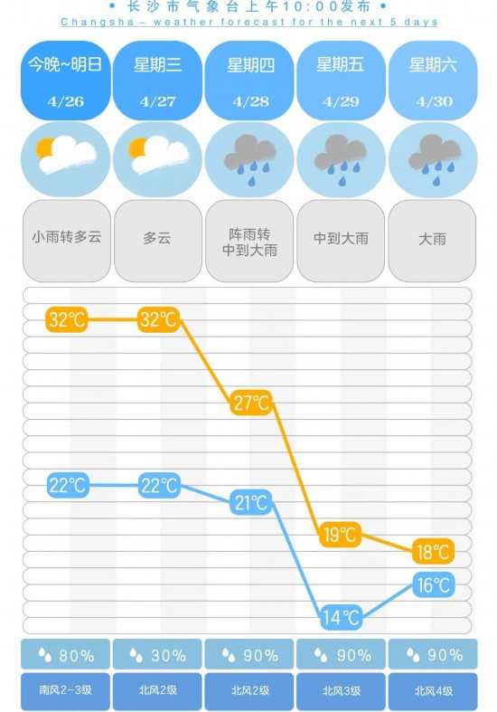 市气象台预计,长沙未来一周降水偏多,有两次较强降水过程。25日下午至前半夜,中等雷阵雨、局地大到暴雨,伴有短时强降水、雷暴大风、冰雹等强对流天气,浏阳市普迹、大瑶、文家市等乡镇有暴雨。累计雨量15~30毫米,局地40~70毫米,最大小时雨量20~40毫米;25日后半夜降水减弱。26日至27日多云,局地阵雨。28日至30日有一次较明显的降温降雨及大风天气过程,气温降幅 8℃~10℃。