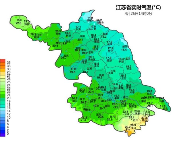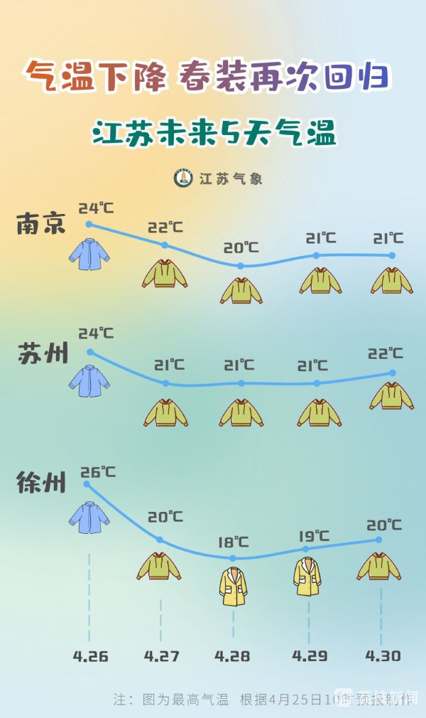 受降水和冷空气双重影响,从4月26-30日,江苏省的气温也将走低,最高气温从近30摄氏度一直降到25摄氏度以下,最低气温只有10摄氏度左右。如果之前已经穿上短袖的,本周要换回长袖了。