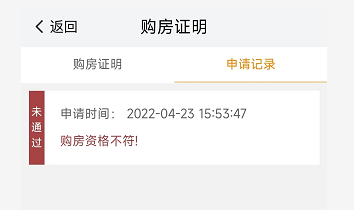 市民刘先生看到扬子晚报/紫牛新闻的报道后,立即在“我的南京”APP上登陆房产频道,填写了个人及家庭相关信息后,申请新的购房证明。他告诉记者,他和爱人名下总共有两套房产,分别位于茶南和鼓楼,都属于“老破小”,一直想再购置一套新房改善居住条件,不过由于限购政策,按规定他无法购买。在等待了约一个小时后,“我的南京”上显示刘先生的购房证明申请“未通过”,原因是“购房资格不符!”。