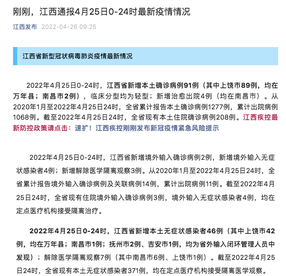 荔枝新闻讯 2022年4月25日0—24时,江西省新增本土确诊病例91例(其中上饶市89例,均在万年县;南昌市2例),临床分型均为轻型;新增治愈出院4例(均在南昌市)。截至2022年4月25日24时,全省现有本土住院确诊病例208例。