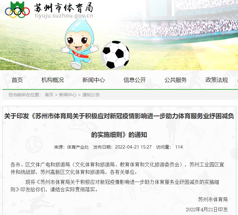 近日,苏州市体育局发布《苏州市体育局关于积极应对新冠疫情影响进一步助力体育服务业纾困减负的实施细则》。