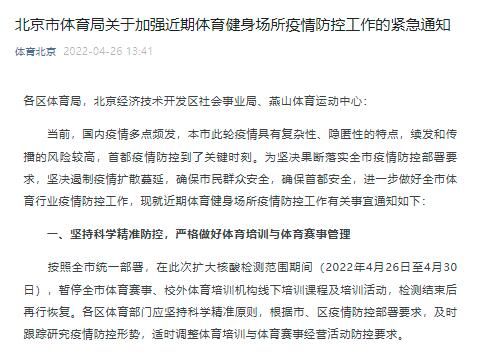 按照全市统一部署,在此次扩大核酸检测范围期间(2022年4月26日至4月30日),暂停全市体育赛事、校外体育培训机构线下培训课程及培训活动,检测结束后再行恢复。各区体育部门应坚持科学精准原则,根据市、区疫情防控部署要求,及时跟踪研究疫情防控形势,适时调整体育培训与体育赛事经营活动防控要求。