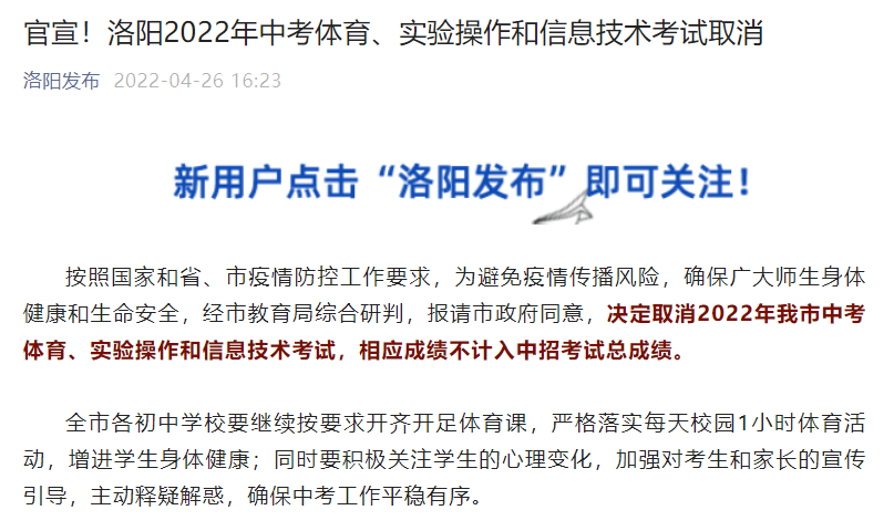 荔枝新闻讯 “洛阳发布”微信公众号4月26日消息,按照国家和省、市疫情防控工作要求,为避免疫情传播风险,确保广大师生身体健康和生命安全,经市教育局综合研判,报请市政府同意,决定取消2022年洛阳市中考体育、实验操作和信息技术考试,相应成绩不计入中招考试总成绩。