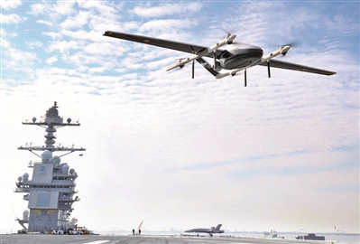 美国海军“蓝水”海上货运无人机向航母运送轻型后勤设备。