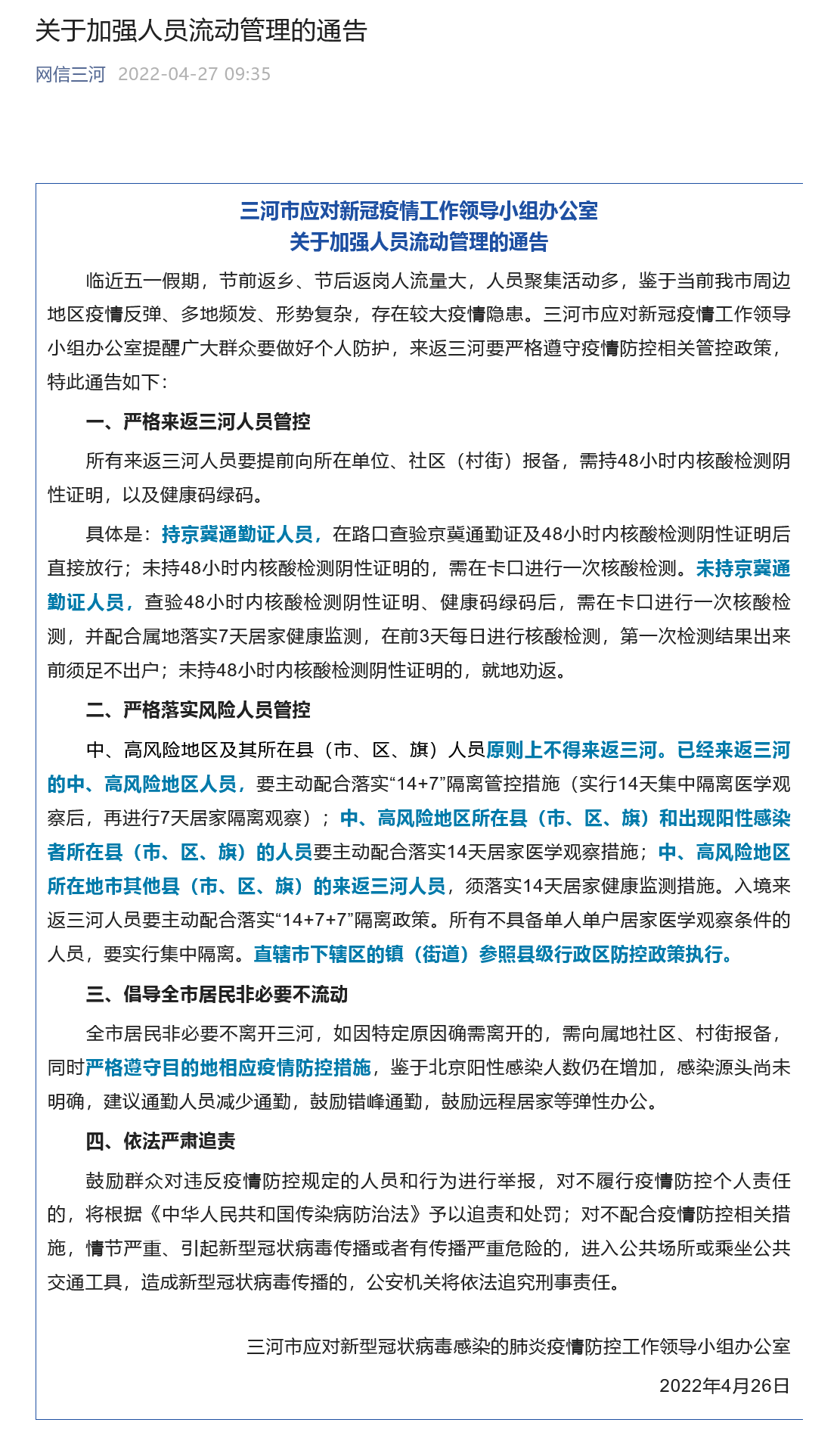 中、高风险地区及其所在县(市、区、旗)人员原则上不得来返三河。已经来返三河的中、高风险地区人员,要主动配合落实“14+7”隔离管控措施(实行14天集中隔离医学观察后,再进行7天居家隔离观察);中、高风险地区所在县(市、区、旗)和出现阳性感染者所在县(市、区、旗)的人员要主动配合落实14天居家医学观察措施;中、高风险地区所在地市其他县(市、区、旗)的来返三河人员,须落实14天居家健康监测措施。入境来返三河人员要主动配合落实“14+7+7”隔离政策。所有不具备单人单户居家医学观察条件的人员,要实行集中隔离。直辖市下辖区的镇(街道)参照县级行政区防控政策执行。