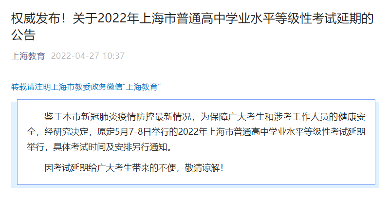 荔枝新闻讯 “上海教育”微信公众号4月27日消息,鉴于上海市新冠肺炎疫情防控最新情况,为保障广大考生和涉考工作人员的健康安全,经研究决定,原定5月7-8日举行的2022年上海市普通高中学业水平等级性考试延期举行,具体考试时间及安排另行通知。