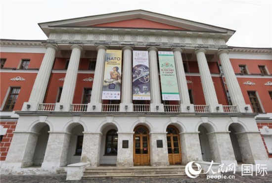 俄罗斯现代历史博物馆正门悬挂“北约·残暴编年史”展览宣传图(左一)。人民网记者 荣翌摄